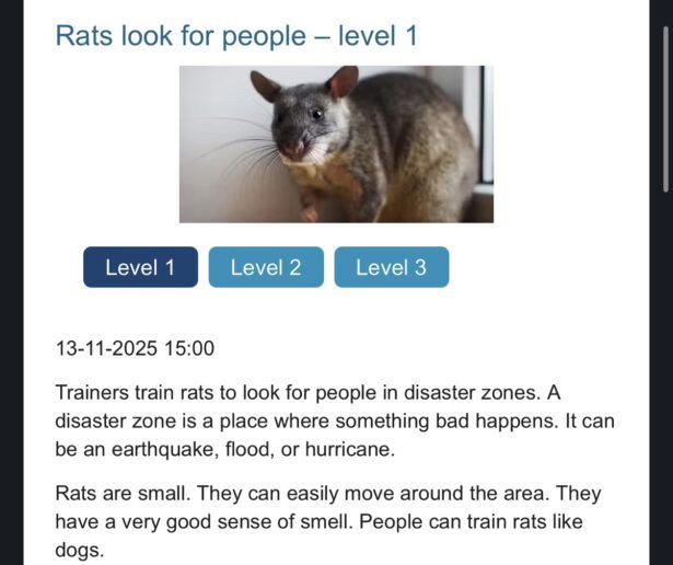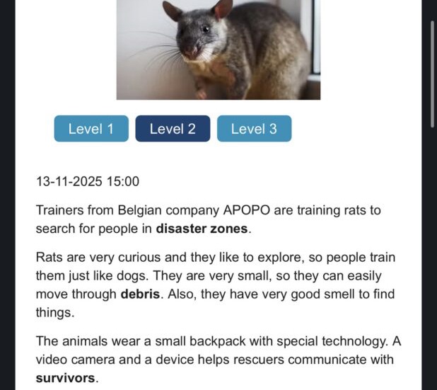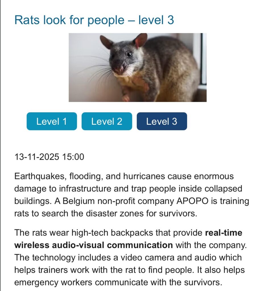 こちらがタイトルにある有能なサイト。記事ごとに内容をレベル1〜レベル3まで難易度を変更できる。記事はほぼ毎日更新される。news in levels